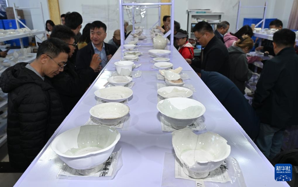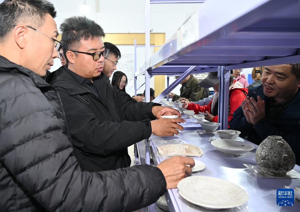考古学家们在苏峪口瓷窑址考古队文物仓库内对出土瓷器进行调查(10月13日摄)。