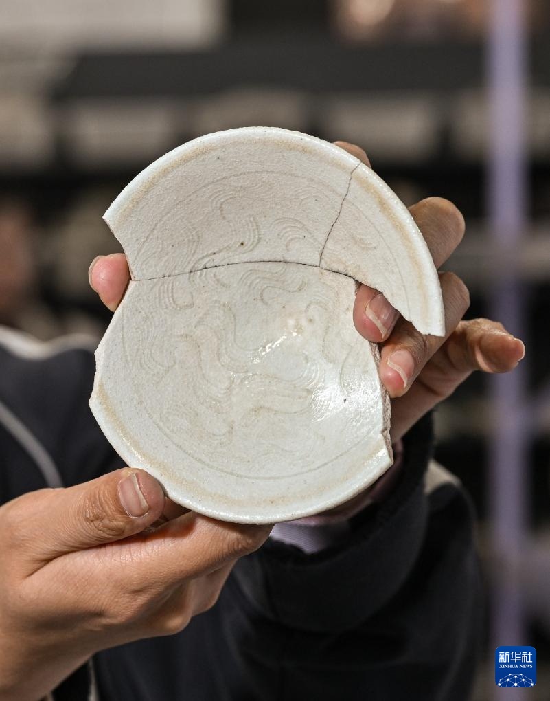 工作人员在苏峪口瓷窑址考古队文物仓库内展现开掘出土的带有刻划斑纹的瓷器残片(10月13日摄)。