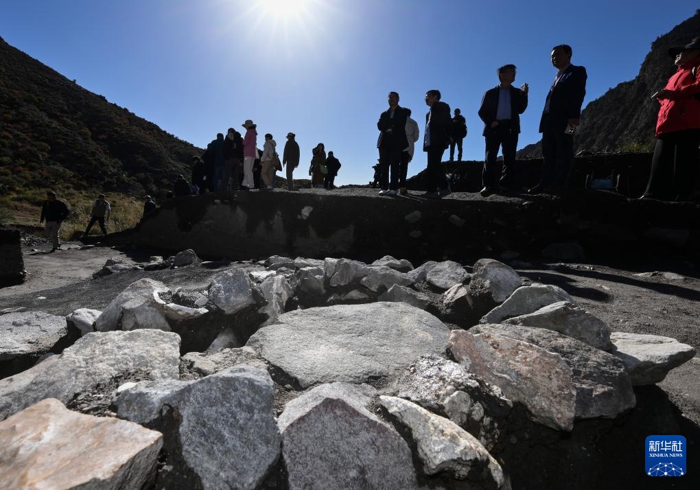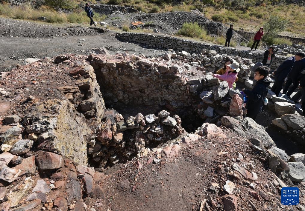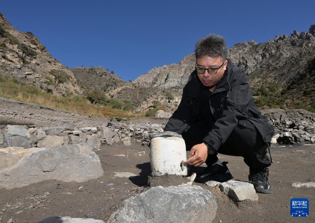 考古学家们在对苏峪口瓷窑址2025年度开掘区出土的一处石英加工遗址进行调查(10月13日摄)。